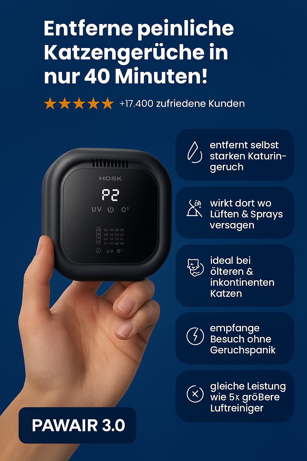 Deine Katze verbringt 90% ihres Lebens in Innenräumen und atmet diese konzentrierte Luft. Moderne Wohnungen sind luftdicht versiegelt und fangen Staub, Hautschuppen, Pollen – und gasförmiges Ammoniak aus dem Katzenklo.